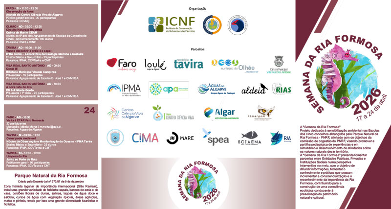 A Semana da Ria Formosa regressa entre os dias 17 e 24 de abril, numa iniciativa do Instituto da Conservação da Natureza e das Florestas (ICNF), em parceria com a Águas do Algarve, com autarquias, associações e diversas outras entidades regionais.