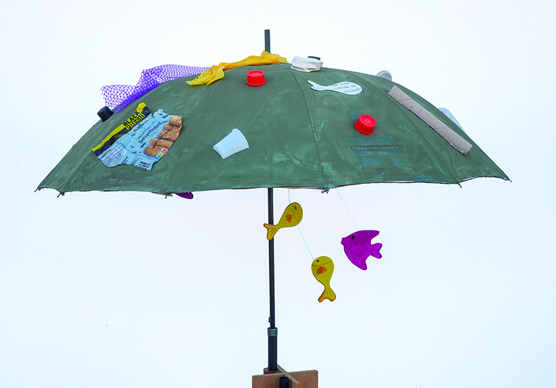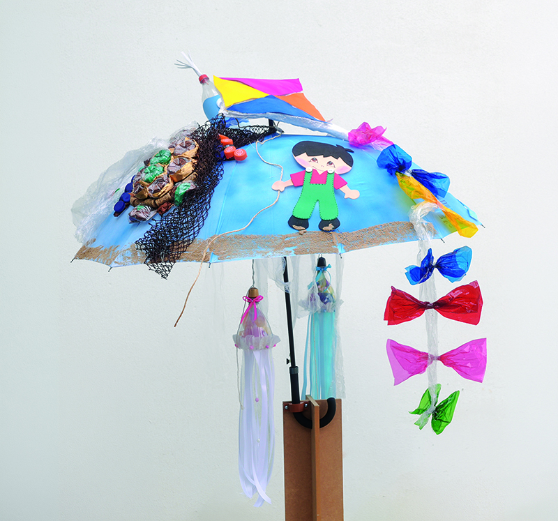 "Splash Splash no Guarda-Chuva" é uma obra criada por crianças, inspirada na biodiversidade marinha, com sereias, medusas e polvos construídos a partir de caixas de ovos e redes de pesca recicladas. O projeto alia criatividade infantil e consciência ambiental, cultivando desde cedo uma relação de afeto e respeito pelo mar e pelas suas criaturas.