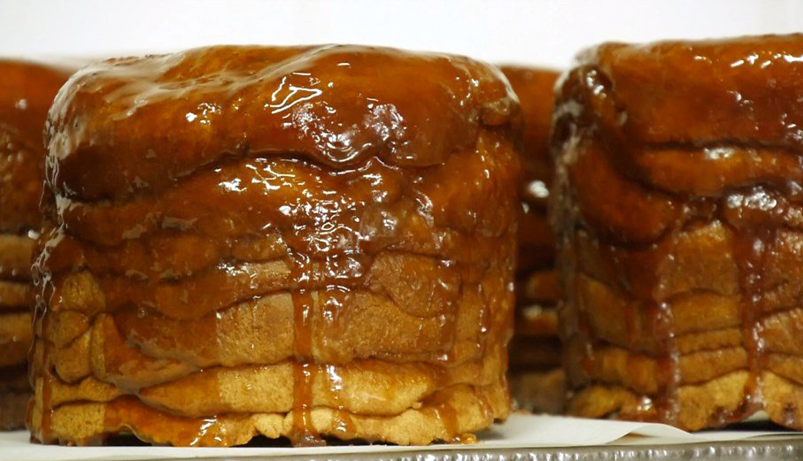 Untar o tacho com bastante manteiga e ir colocando os círculos da massa, até encher completamente o tacho.